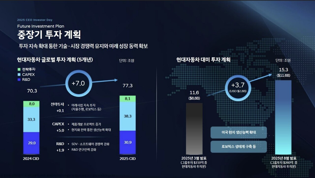 현대차는 2026년부터 2030년까지 5개년 간 총 77조3000억원의 대규모 투자를 단행하여 미래 경쟁력 확보에 나선다. 이는 지난해 제시했던 투자 계획보다 7조원 증액된 규모다. 투자는 연구개발(R&D) 30조9000억원, 설비투자(CAPEX) 38조3000억원, 전략 투자 8조1000억원 등으로 배분된다. 특히 최대 시장인 미국에는 4년간 15조3000억원(116억달러)을 투자하여 현지 역량을 강화할 방침이다.