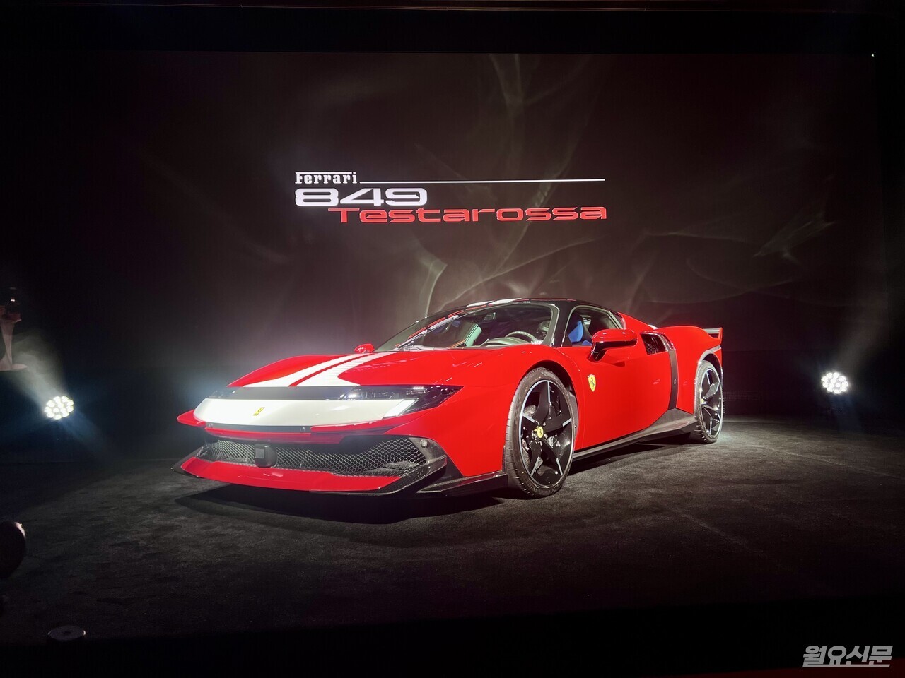 14일 서울 반얀트리 클럽 앤 스파에서 1050마력의 플러그인 하이브리드 슈퍼카 '849 테스타로사'의 전·측면 모습. 1970년대 스포츠 프로토타입에서 영감을 받은 디자인은 시속 250km에서 415kg의 다운포스를 생성하며 이는 SF90 스트라달레 대비 25kg 증가한 수치다. 사진=김윤겸기자