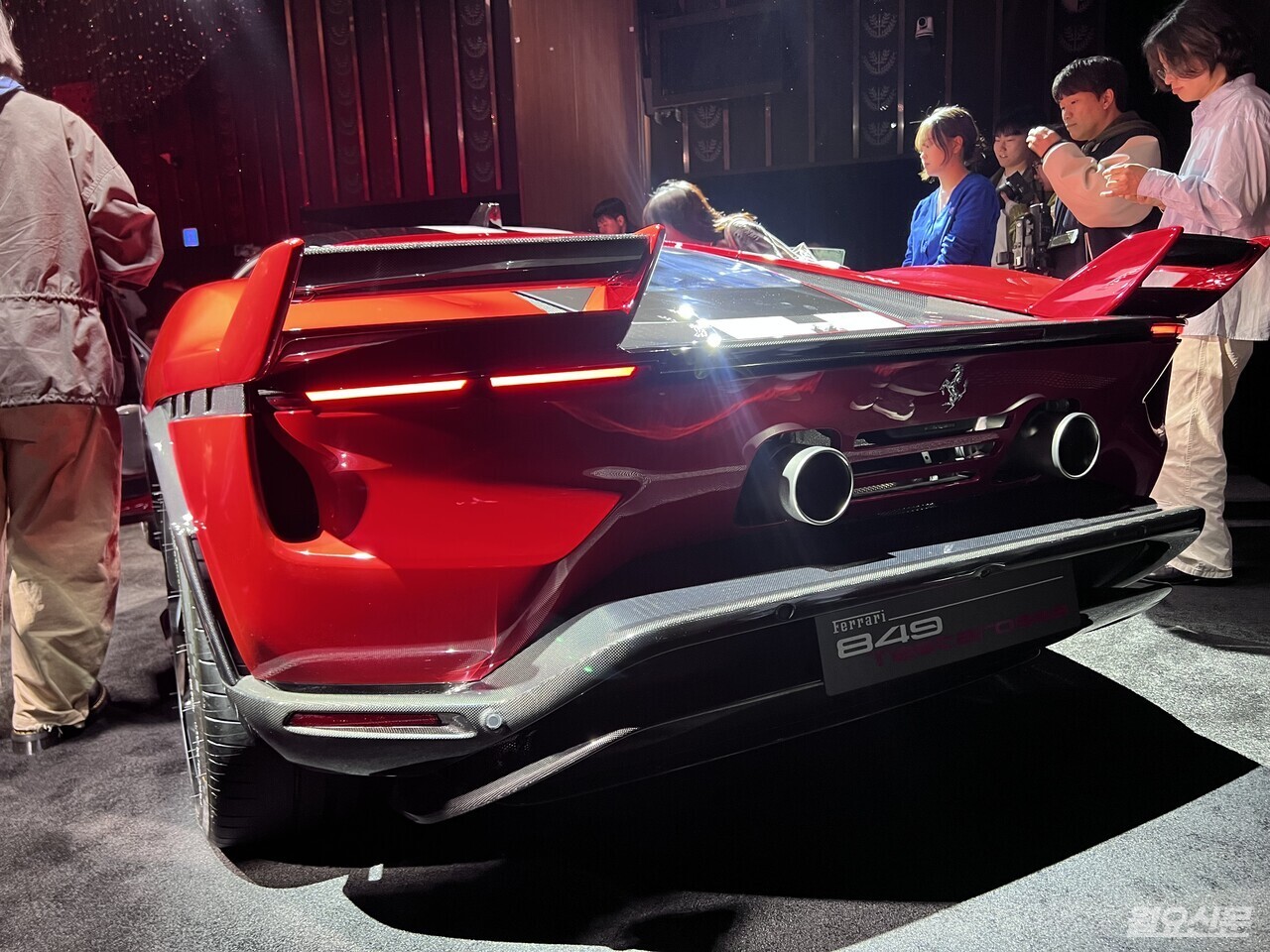 서울 반얀트리 클럽 앤 스파에서 1050마력의 플러그인 하이브리드 슈퍼카 '849 테스타로사'의 후면부 모습. 후면의 액티브 스포일러와 고정식 트윈 테일 구조는 공기역학적 기능과 시각적 완성도를 동시에 높였다. 사진=김윤겸기자