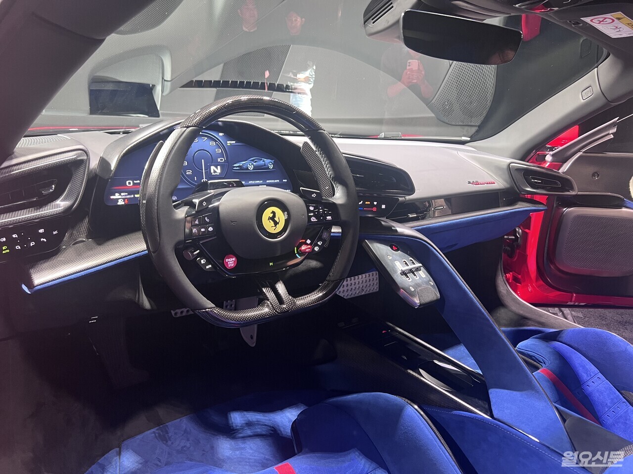 서울 반얀트리 클럽 앤 스파에서 1050마력의 플러그인 하이브리드 슈퍼카 '849 테스타로사'의 실내 모습. 운전자는 디지털 계기판과 새로운 HMI를 통해 차량을 직관적으로 제어할 수 있으며 동승자 또한 전용 디스플레이를 통해 주행 정보를 함께 확인할 수 있다. 사진=김윤겸기자