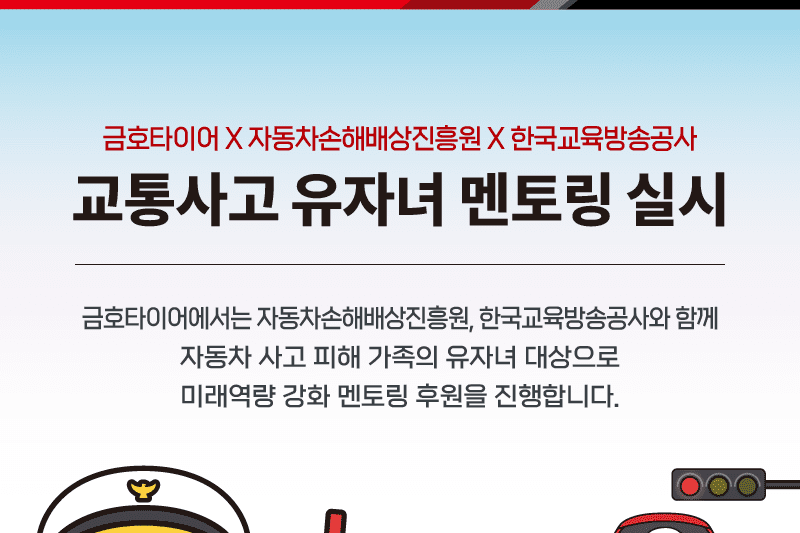금호타이어는 자동차손해배상진흥원(자배원), 한국교육방송공사(EBS)와 함께 자동차사고 피해가정 유자녀 미래역량강화 멘토링 지원사업을 진행한다. 이 프로그램은 2021년 시작됐으며 사고 피해 가정 유자녀의 경제·정서적 부담을 줄이고 학습 동기와 자립성을 높이기 위한 취지다.